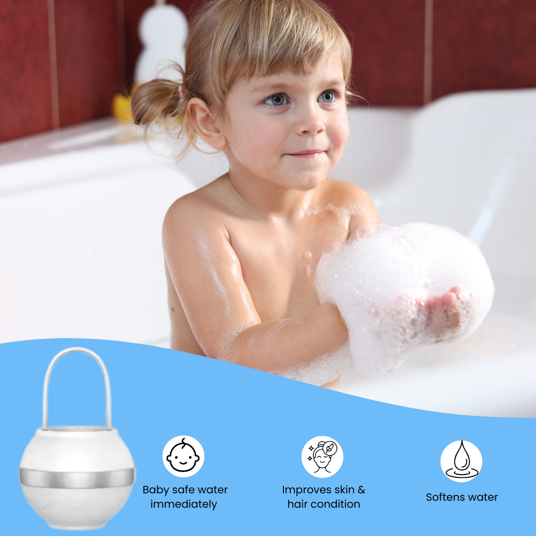The SeraSoothe Bath Ball Filter naturally soothes and protects delicate skin by removing harsh chemicals like chlorine, heavy metals, and rust, leaving only soft, gentle water that’s kind on sensitive skin.